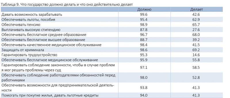 Впрочем, ответы на вопросы об ожиданиях указывают, что беларусы, кроме выполнения госструктурами своих прямых обязанностей, скорее, ждут от государства предоставления им возможностей, а не того, что госструктуры будут все решать за них. Например, что государство будет защищать от криминала, обеспечивать бесплатное образование, пенсию и определенный уровень соцзащиты.