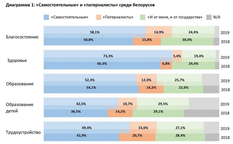 Это не единственное исследование, подтверждающее уход белорусов от патернализма. Проведенный в 2019 году другой структурой опрос тоже показал, что граждане Беларуси склонны больше полагаться на себя, чем на государство, в вопросах благосостояния, образования, здравоохранения и трудоустройства.