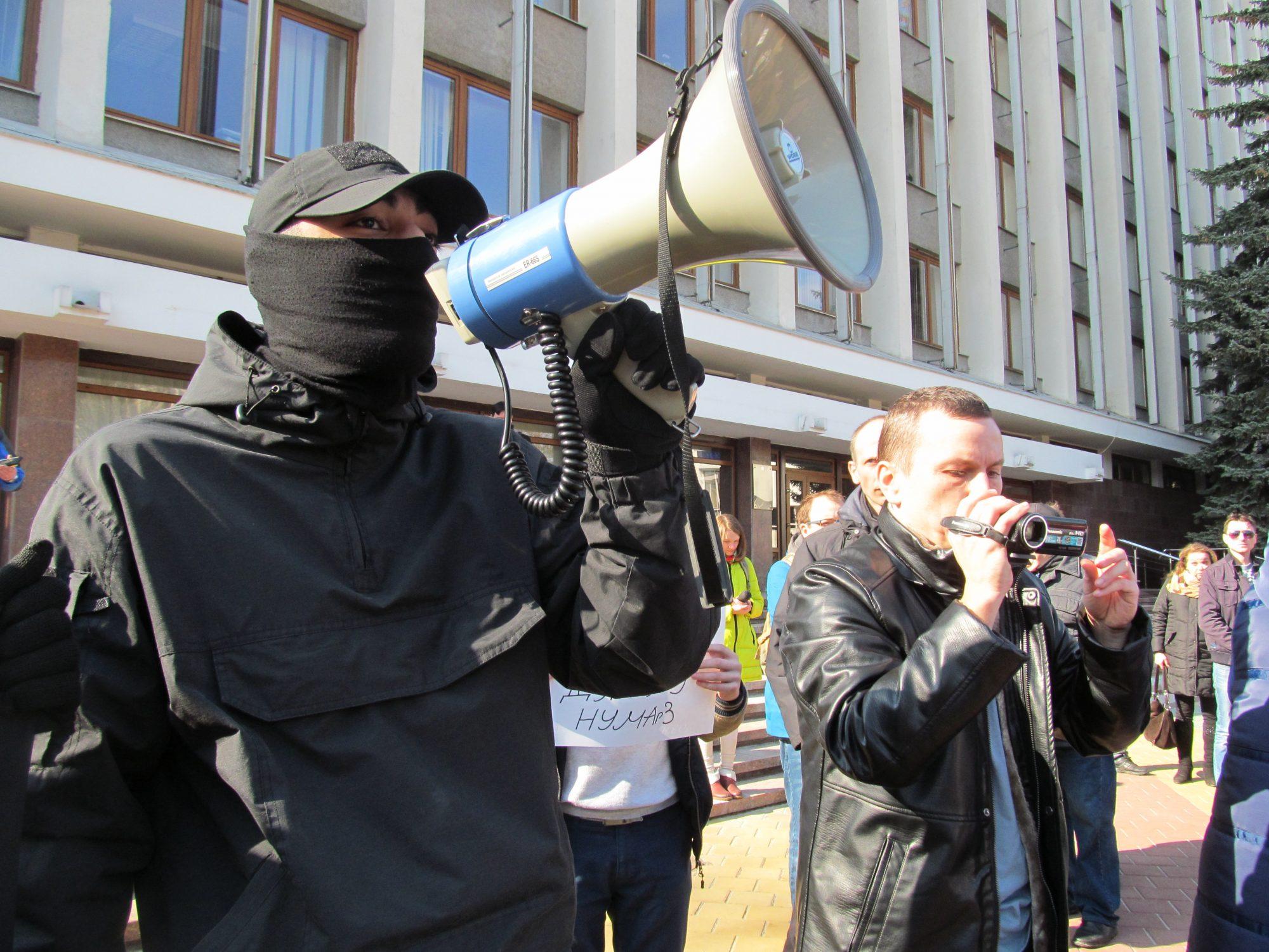 Один из участников, стоя на ступеньках здания горисполкома, говорит в мегафон: «Мы встречаемся с мэром, которого не выбирали».
