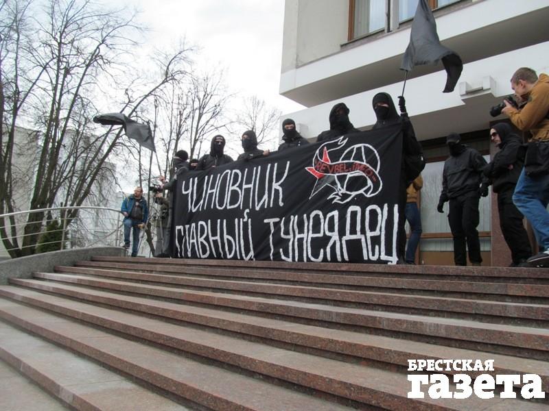 Участники акции, которые остались ждать у горисполкома, ждут выхода других. На ступеньки горисполкома вышли анархисты с растяжкой: «Чиновник — главный тунеядец». Люди по очереди эмоционально выражают свое несогласие по поводу декрета №3.