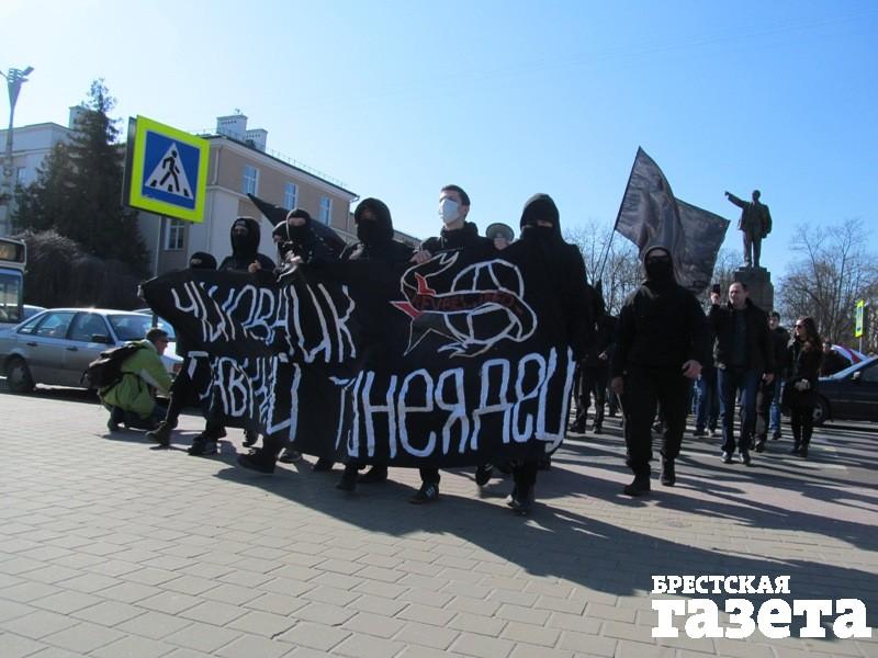 Анархисты взяли организацию акции на себя. Приглашают прохожих присоединиться к ним. Участники периодически останавливаются, кричат речевки, а также: «Уходи», «Жыве Беларусь», «Власть грабит народ».