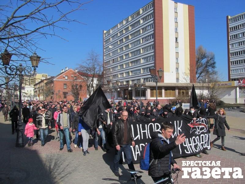 Участники акции идут по ул. Пушкинской. Маршрутки и другие машины сигналят. Повернули на Советскую. Начало колонны — у ТЦ «Дидас Персия», хвост — у «Белтелекома». Люди скандируют «Нет декрету №3», «Нет зарплаты, есть налог — депутату в кошелек», «Настоящий дармоед — тот, кто выдумал декрет» и хлопают, привлекая внимание прохожих.