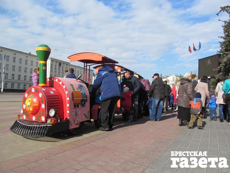 На площади Ленина в Бресте громкая музыка, проходят гуляния, детей катают на паровозах.