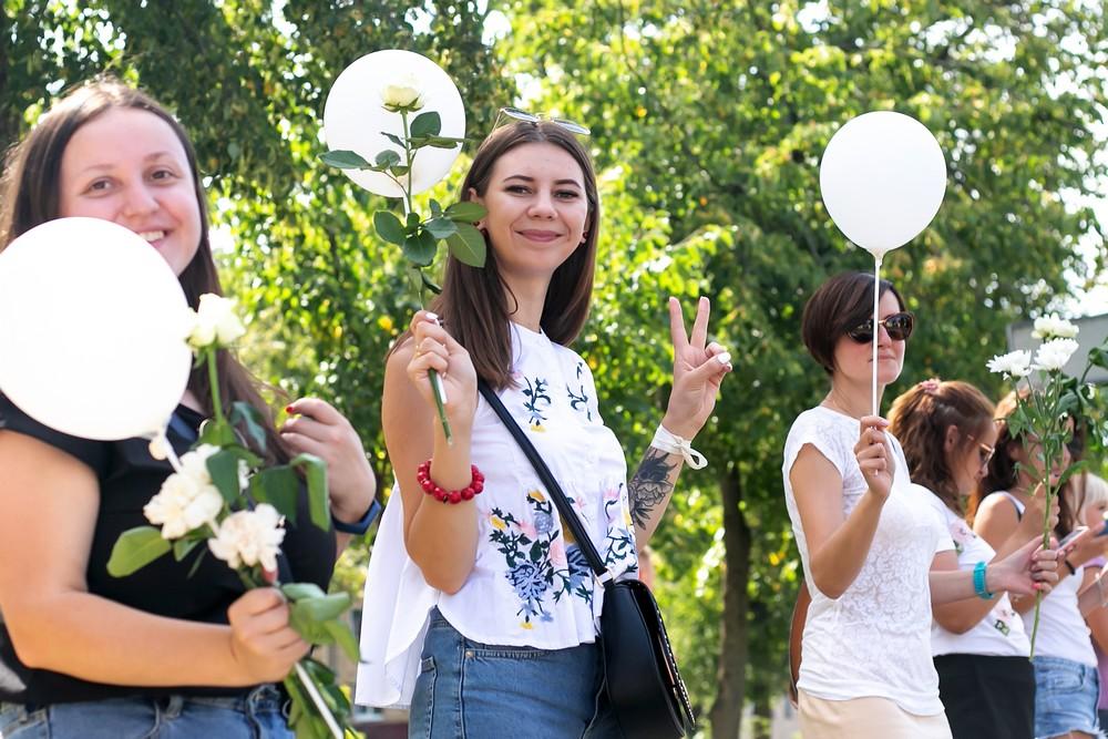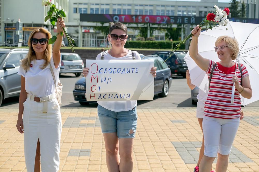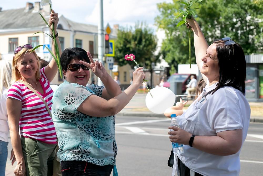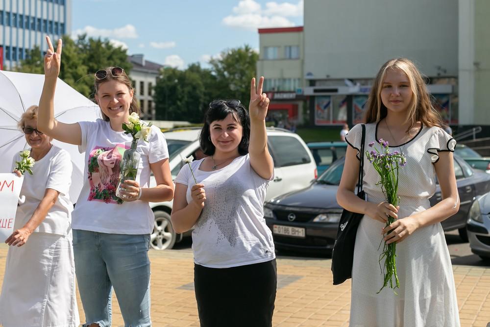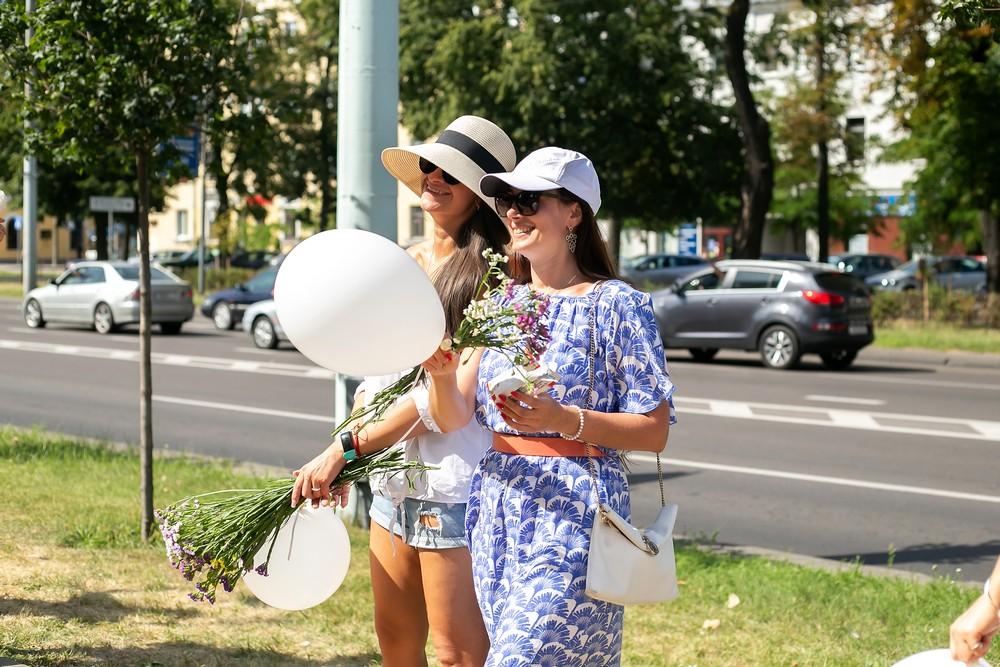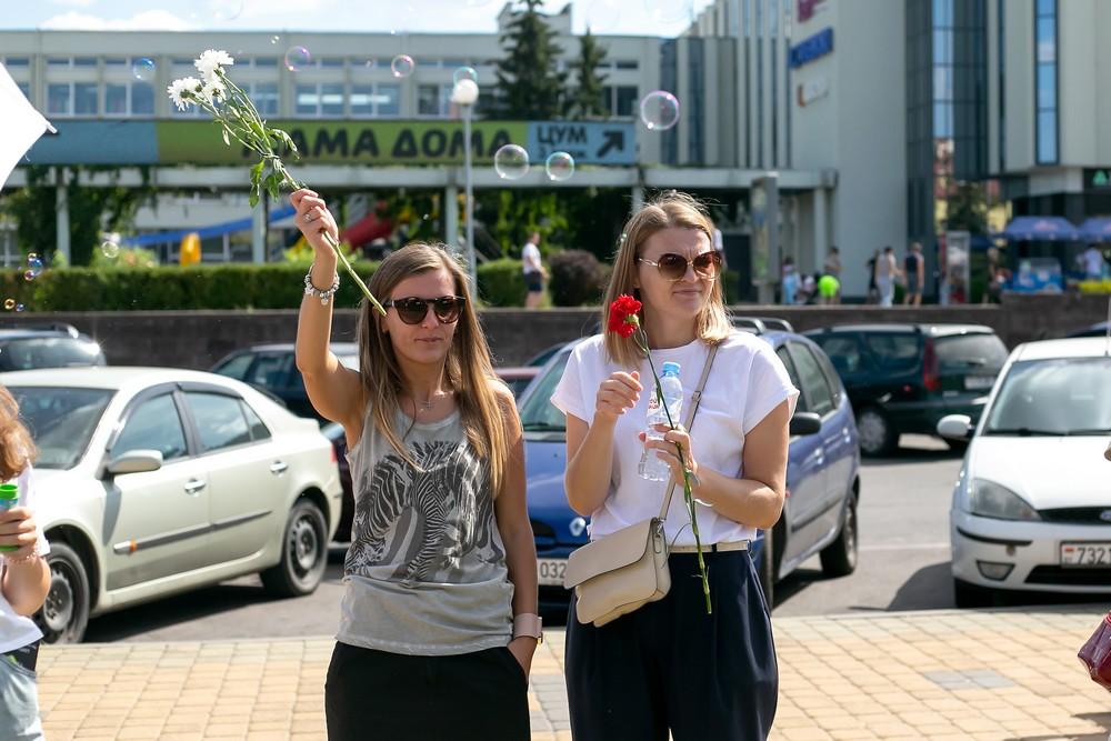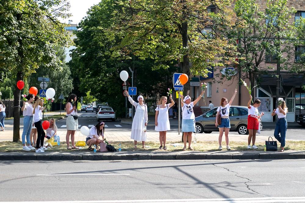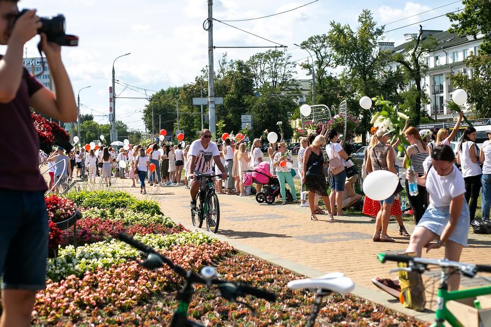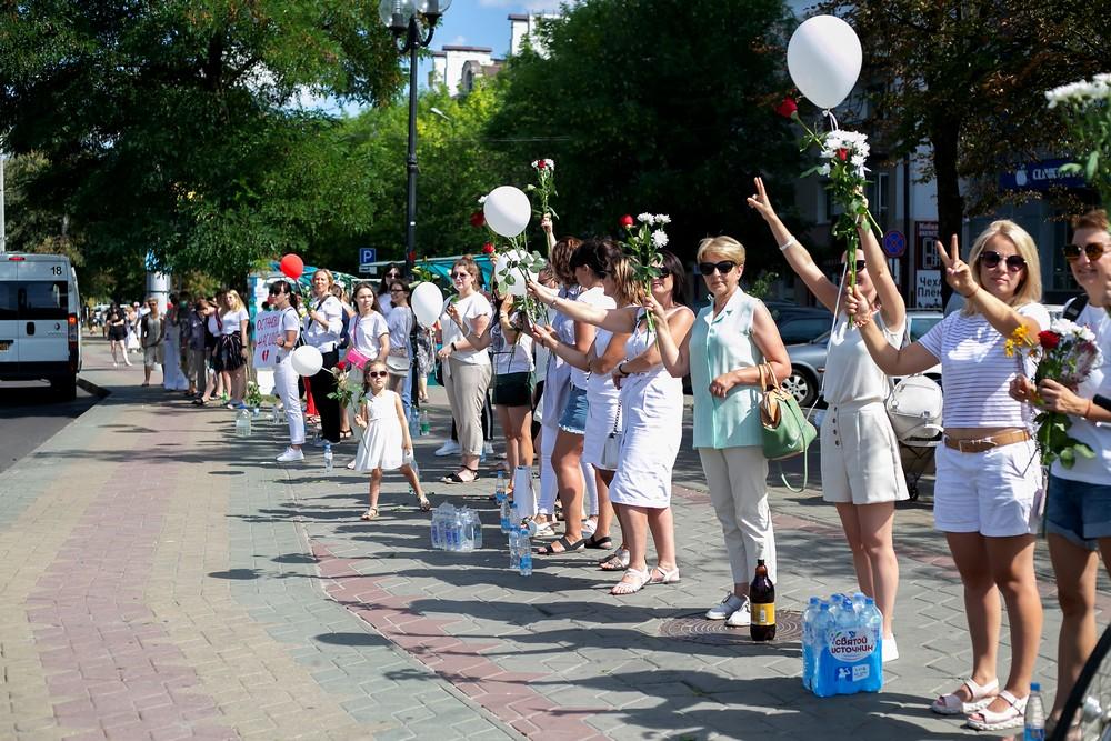Женщины выстроились вдоль проспекта Машерова от улицы Ленина до Кобринского моста с мирной акцией несогласия в пятницу 14 августа в Бресте.