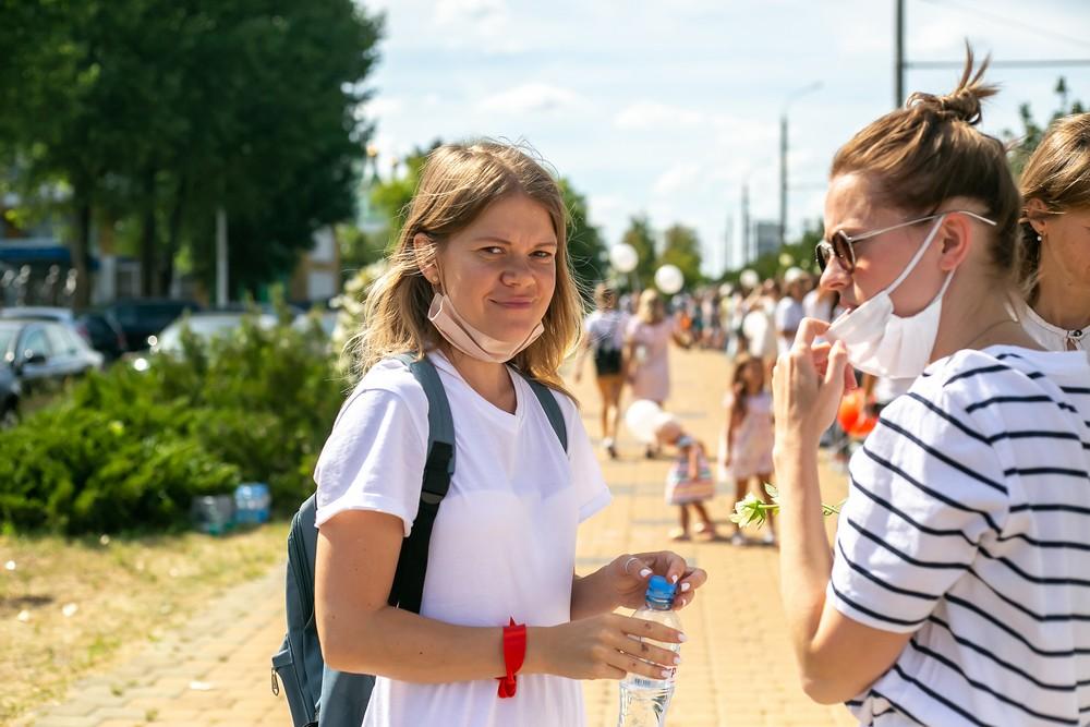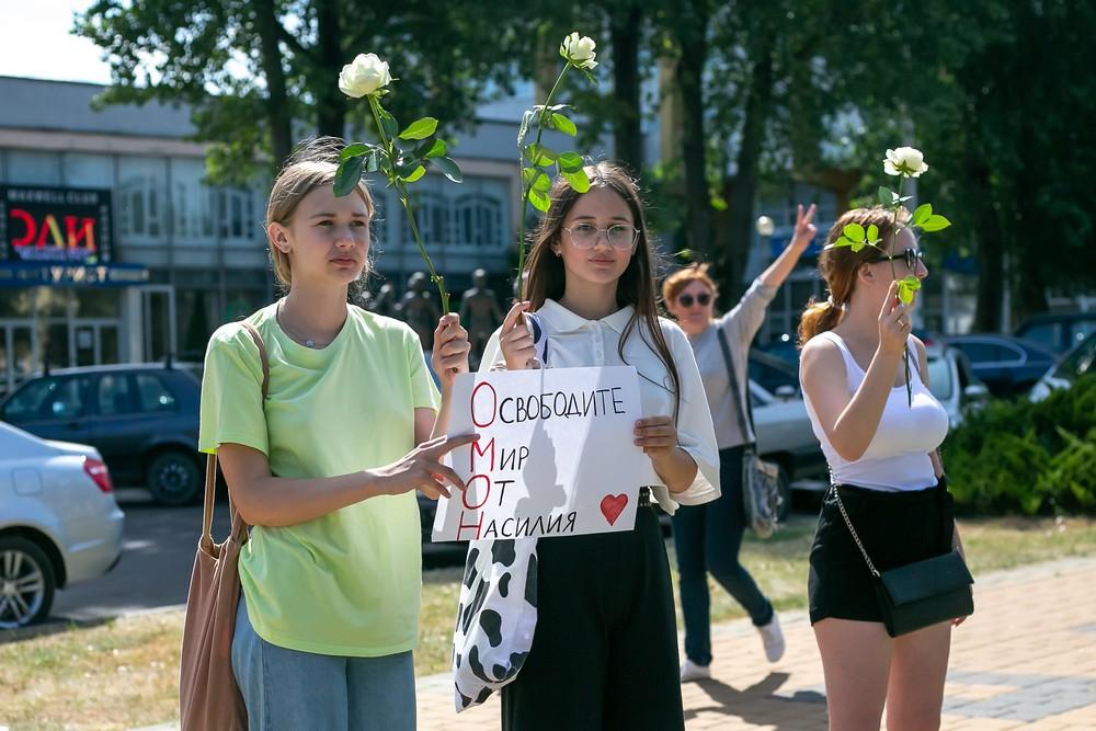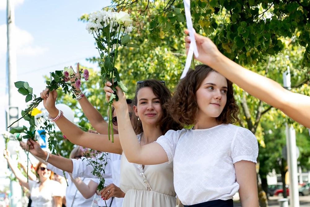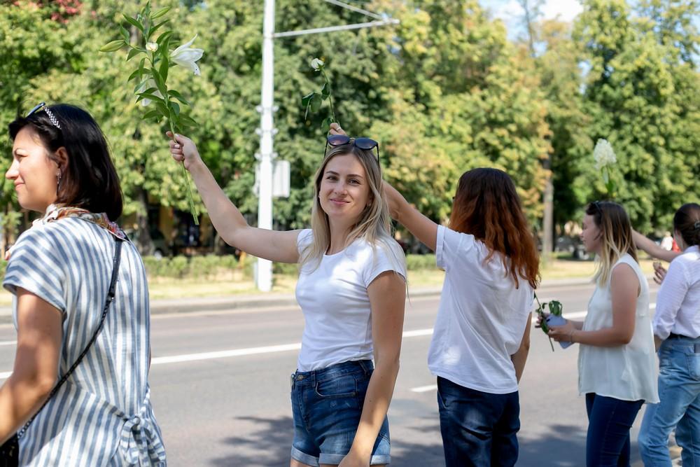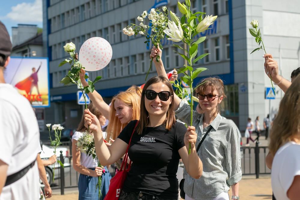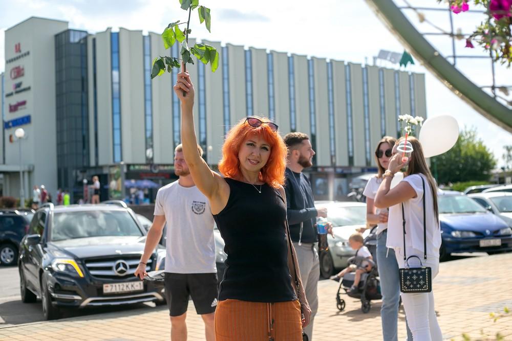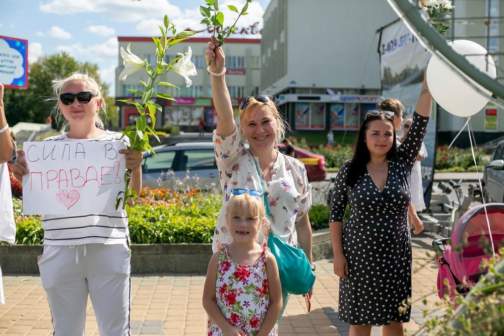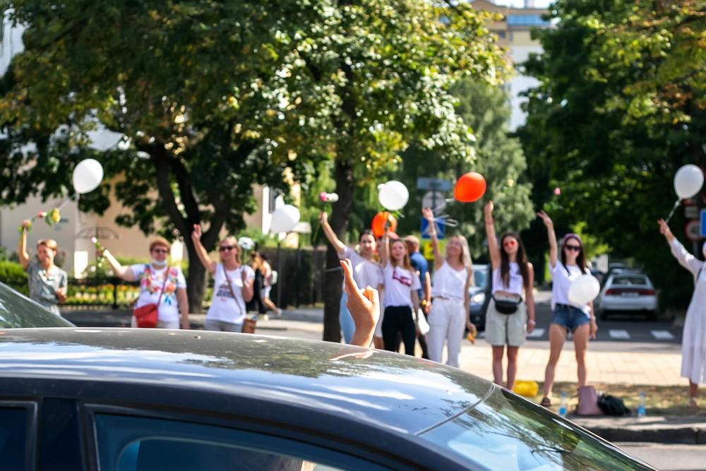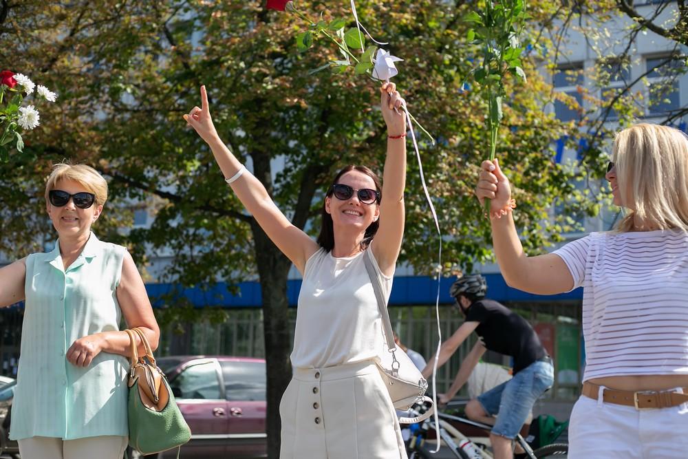 Женщины выстроились вдоль проспекта Машерова от улицы Ленина до Кобринского моста с мирной акцией несогласия в пятницу 14 августа в Бресте.