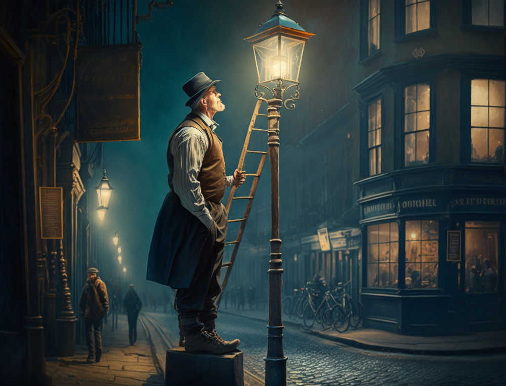 На этой картинке Midjourney сделала акцент на фонаре. А вот фонарщик оказался пожилым мужчиной.
