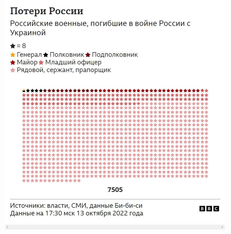 Русская служба Би-би-си ведет поименный список потерь российских военнослужащих в Украине совместно с изданием «Медиазона» (признано в России «СМИ-иноагентом») и командой волонтеров. На 14 октября им удалось подтвердить информацию о 7 502 погибших солдатах и офицерах.