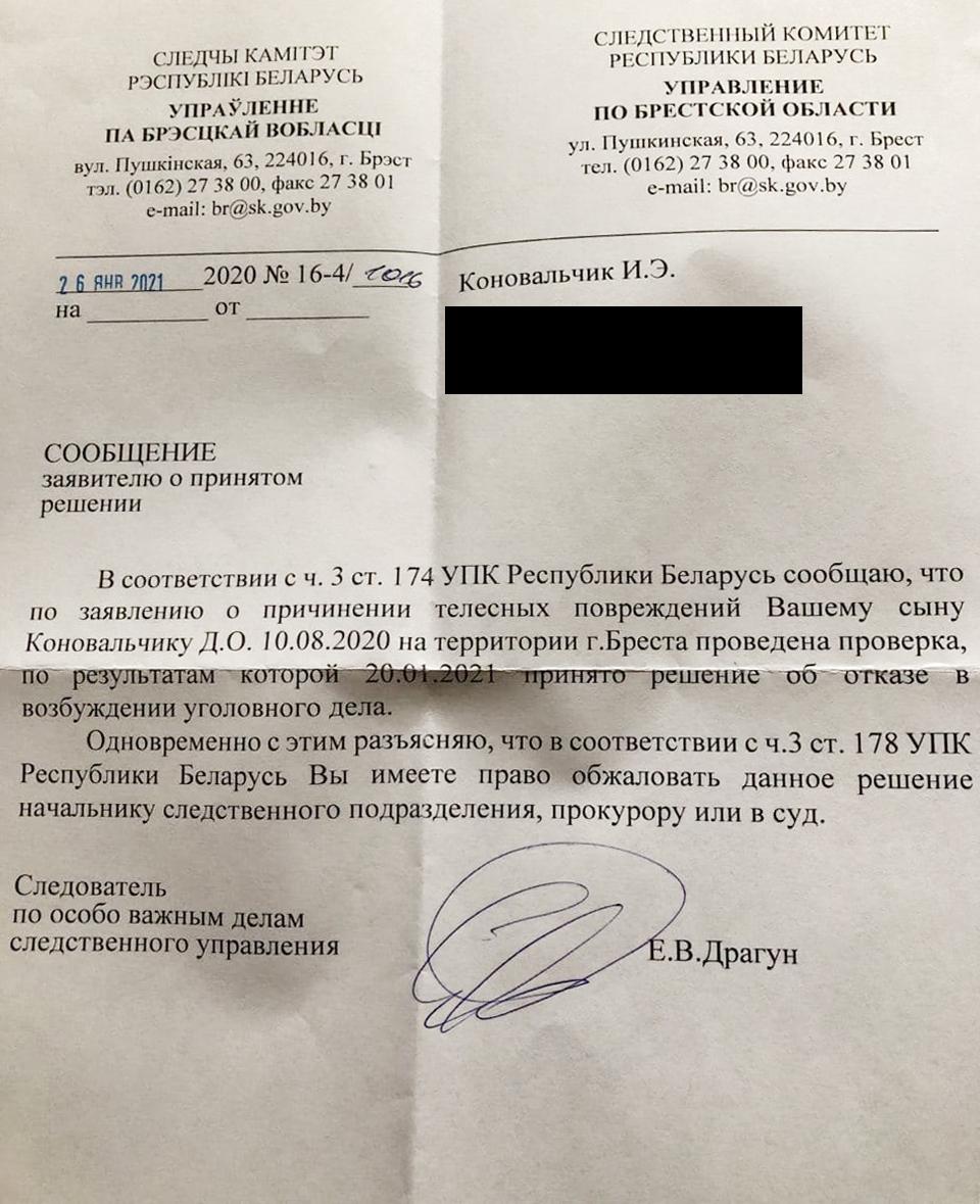 В конце сентября брестчанка получила письмо из СК, в котором сообщалось, что срок проверки по ее заявлению продлен до трех месяцев. В ноябре 2020 года проведение проверки было приостановлено. Потом — 12 января 2021 года — возобновлено. А 27 января Инна Коновальчик узнала об отказе в возбуждении уголовного дела.