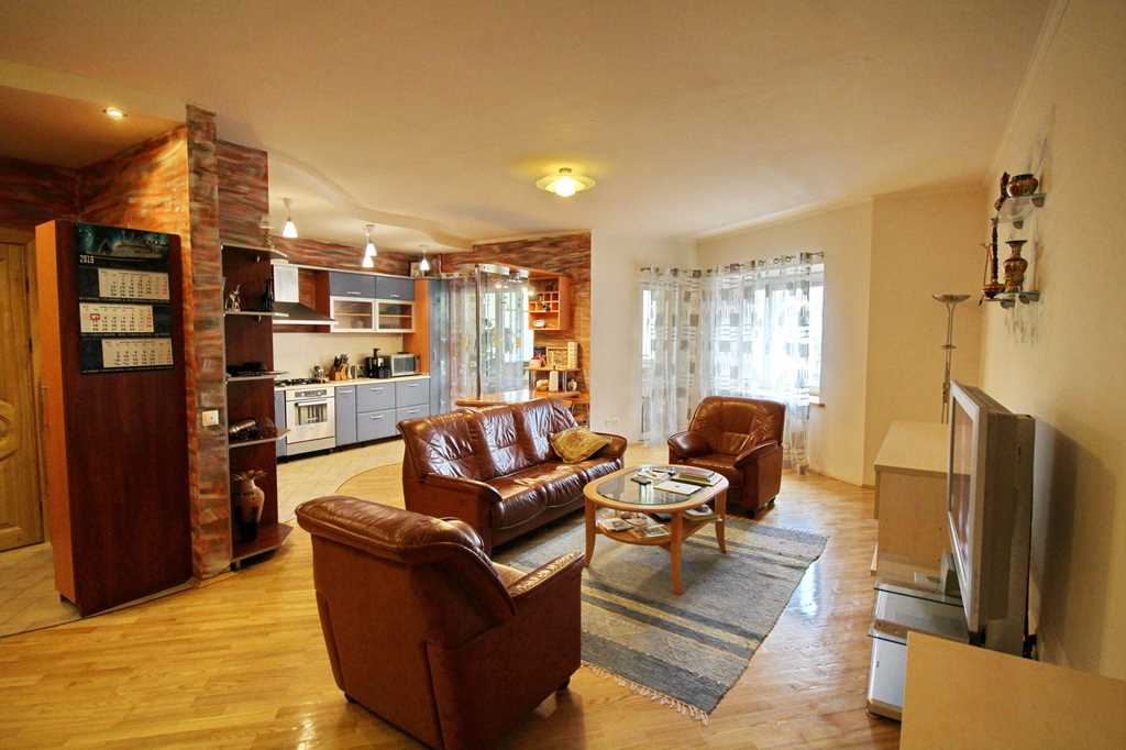Шестикомнатную квартиру общей площадью почти 300 “квадратов” продают на Киевке. Находится она на первом этаже дома 2004 года постройки. Кроме жилых комнат, гостиной, кухни и ванной здесь есть подсобное помещение с гаражом на два автомобиля.