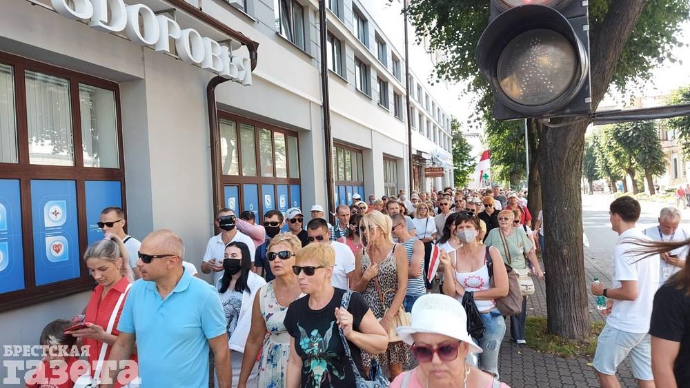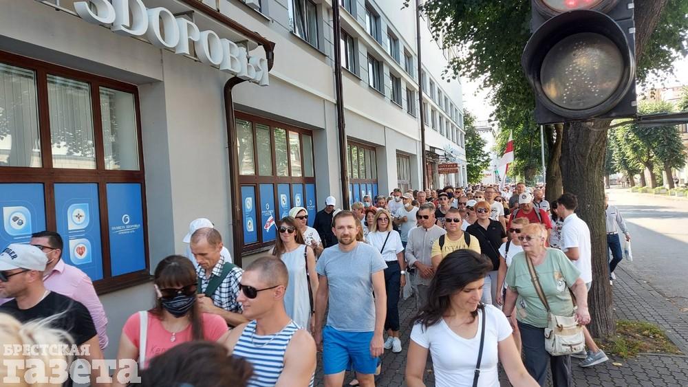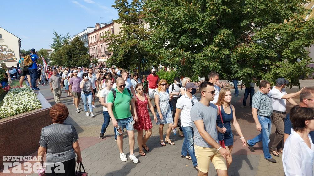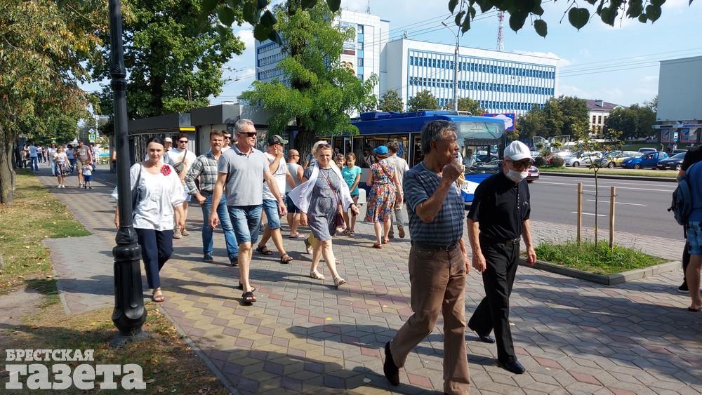 Около 15.30 колонна людей в Бресте уже идет по тротуару и проезжей части проспекта Машерова от улицы Ленина в сторону бульвара Космонавтов. «Голова» колонны находится возле СШ №13, а «хвост» — возле гостиницы «Интурист».