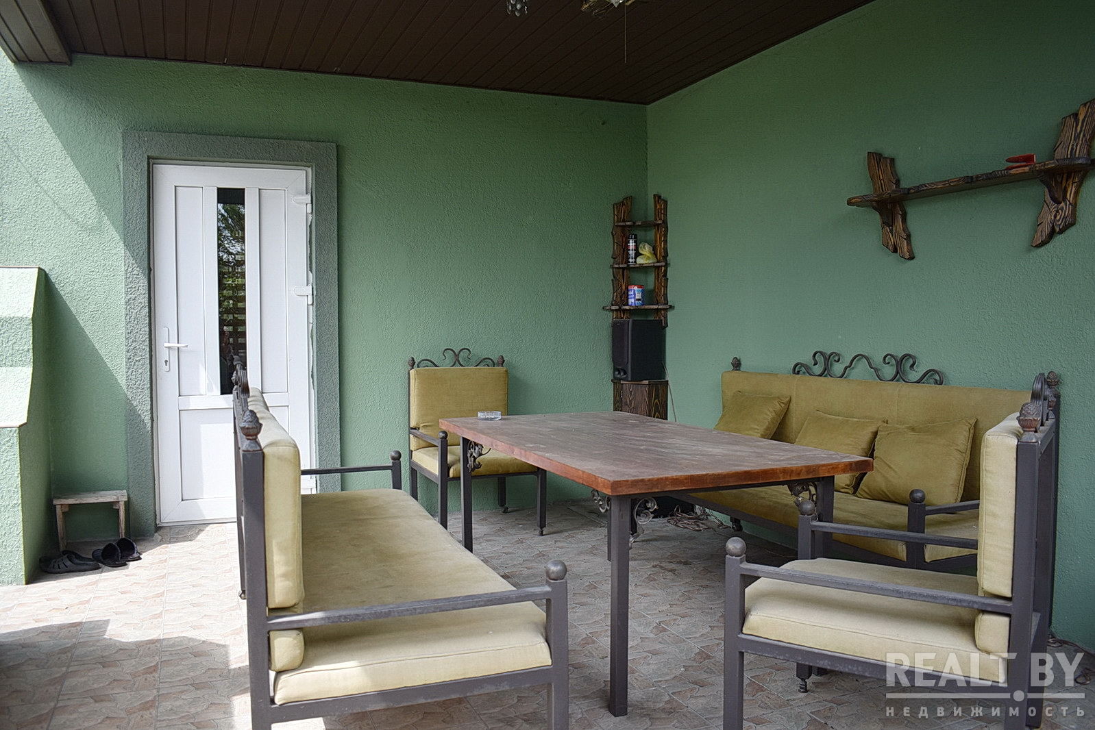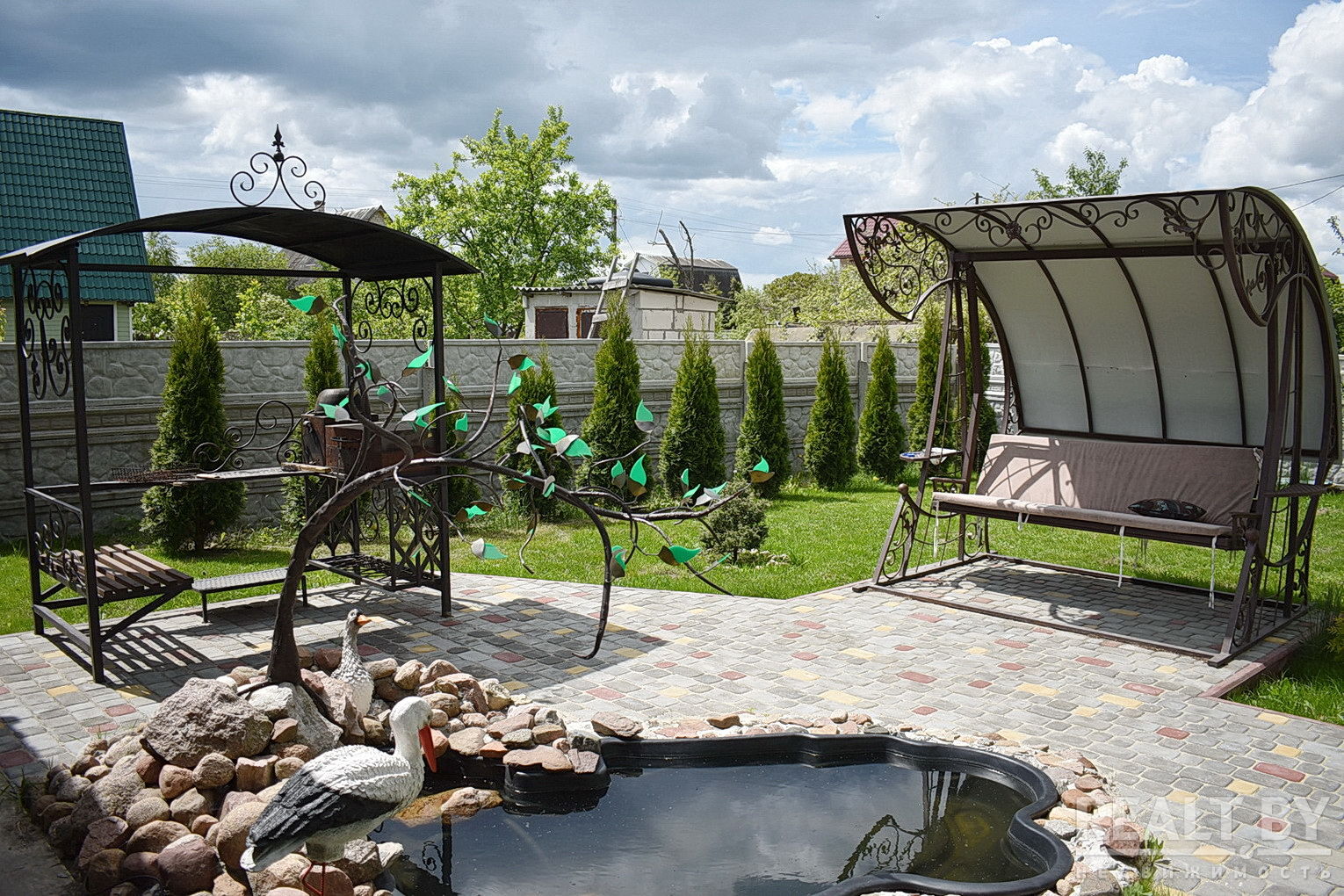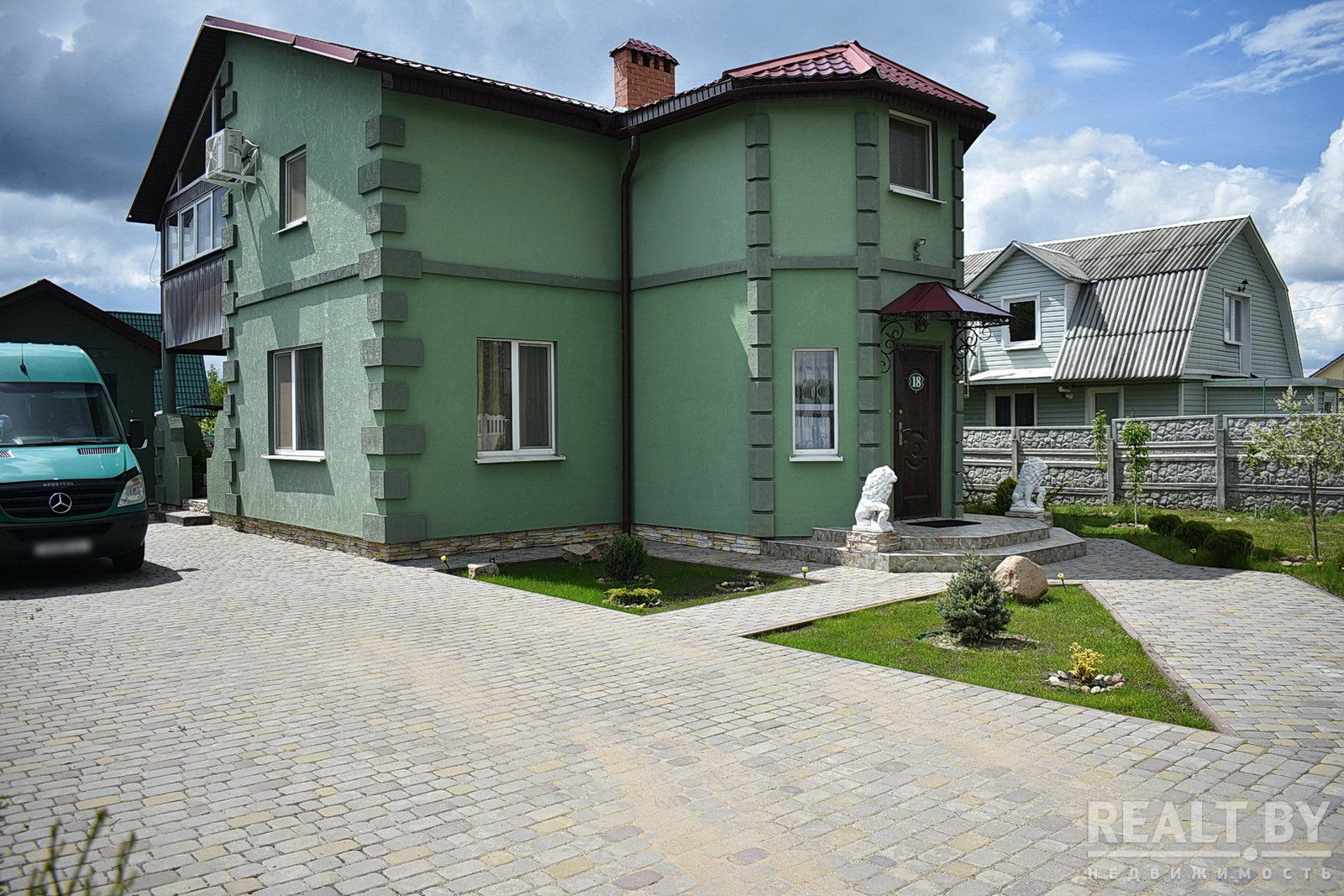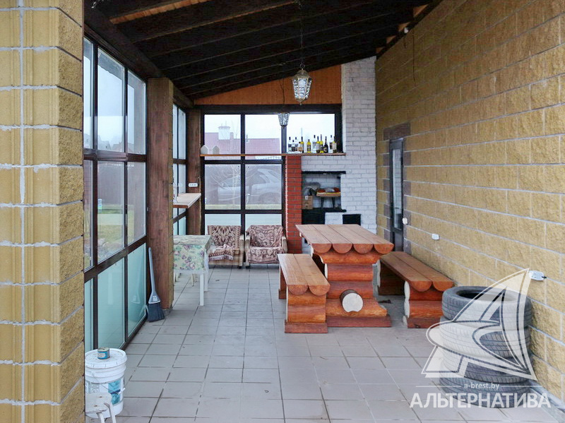 Дворовые дорожки выложены тротуарной плиткой. Установлена охранная сигнализация. У входа в дом терраса с навесом и зоной барбекю, деревянные лавки и стол на большую компанию.