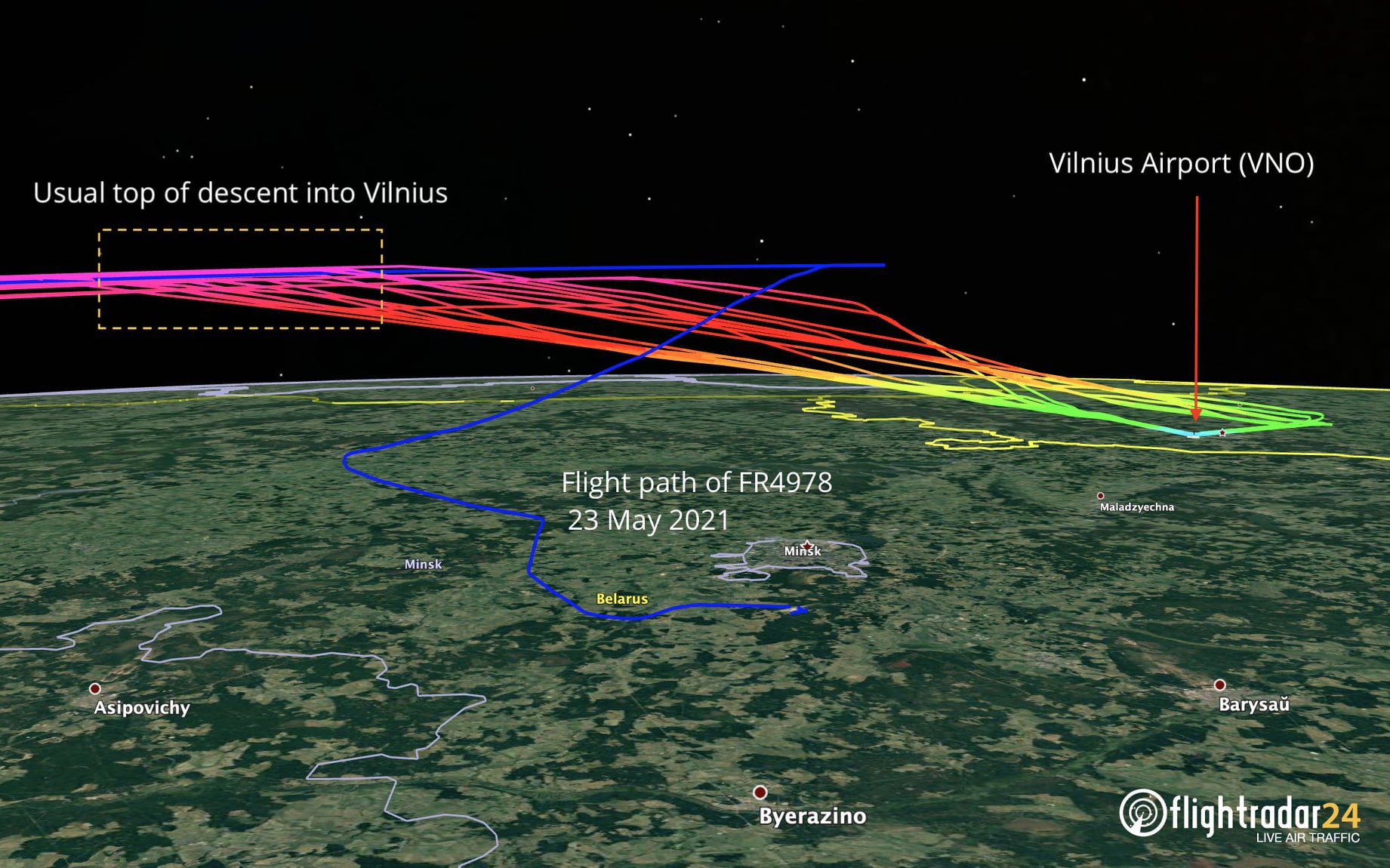 Днем 23 мая рейс авиакомпании Ryanair Афины—Вильнюс экстренно сел в национальном аэропорту «Минск» — якобы во время полета поступило сообщение о минировании лайнера. В аэропорту Минска провели проверку, взрывных устройств не нашли.