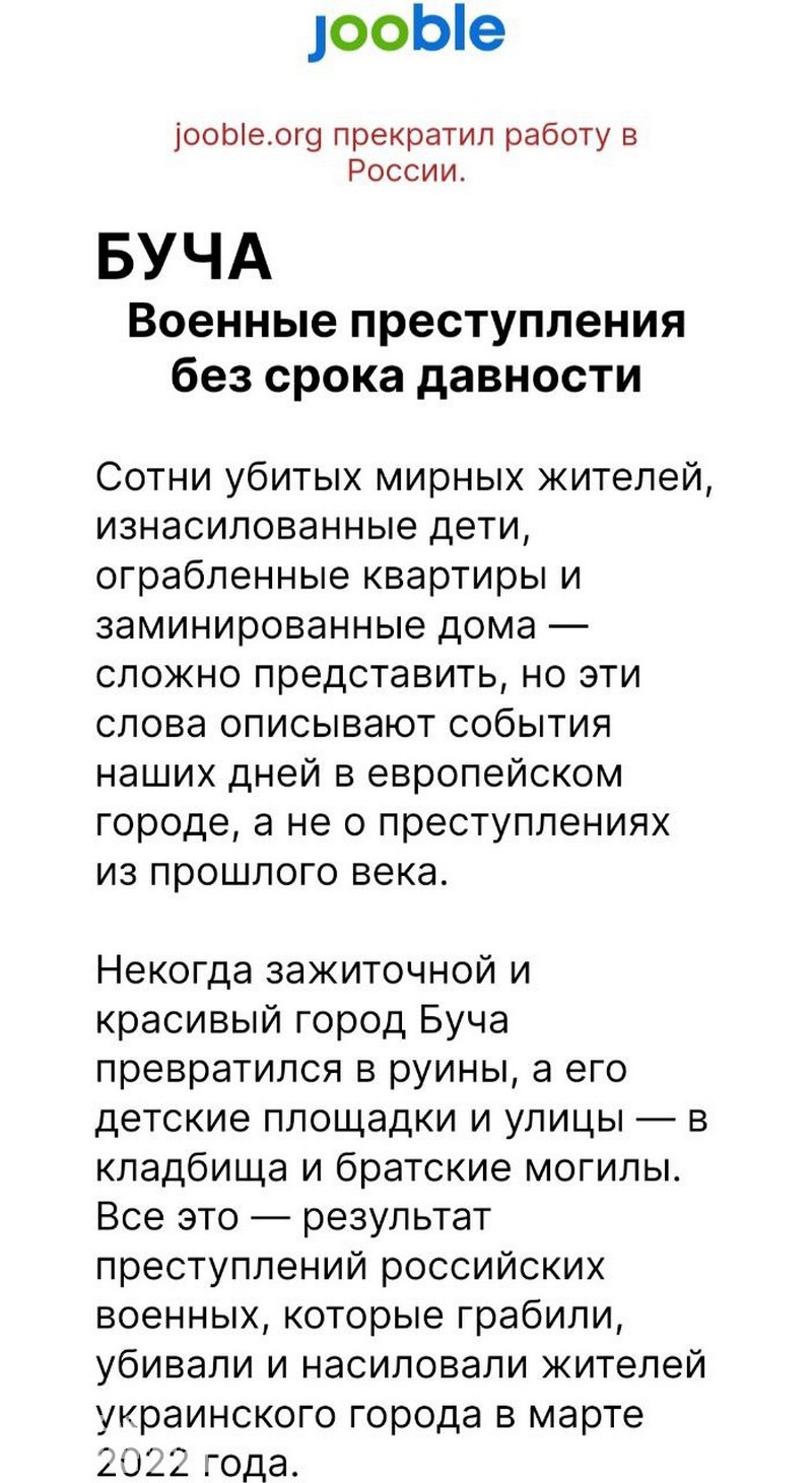 «Каждый новый сотрудник – это новые налоги. Сейчас эти деньги идут в руки беларуского правительства, которое предоставило России плацдарм для запуска огня по Украине. Jooble не спонcирует войну», – такую фразу видит соискатель вакансии, попавший на сайт Jooble.by.