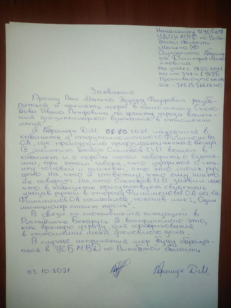 Они тоже просили записать видео, где я говорю, что я признаю вину и осознаю это. Но мы пришли к тому, что я не смогу записать такое видео. Тогда сотрудник пошел позвонить кому-то, вернулся и предложил записать видео, что я добровольно вышел из этого чата. Здесь не было чего-то такого, поэтому я сказал на камеру: «Я, Абрамук Дмитрий Михайлович, отписался от телеграм-чата «Волейбол по выходным». Больше меня не трогали, — рассказывает экс-политзаключенный.