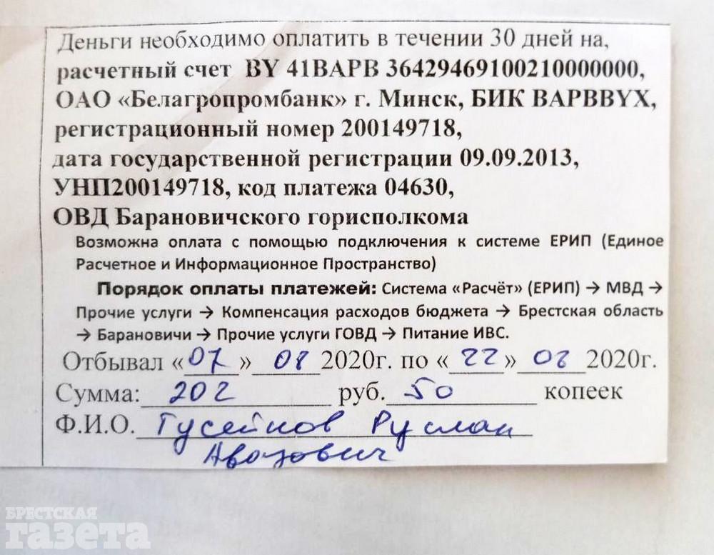 «Через какое-то время подъехала машина, оттуда выбежали четыре человека и окружили меня. Мне сказали выложить содержимое карманов на автомобиль, показать руки. Меня обыскали и забрали все. Затем я, не оказывая сопротивления, сел в их автомобиль, и меня отвезли в отделение милиции Западного микрорайона Пинска. Там оформили протокол задержания, просили дать какие-то разъяснения и поставить подпись, но я отказался. Были нарушены мои права в вызове адвоката и на звонок родственникам. В итоге мои родные объявили меня в розыск, потому что двое суток не могли меня найти. Мое задержание тщательно скрывали, чтобы не нагнетать волну протестов. Все возможные организации, в том числе поисково-спасательный отряд «Ангел», принялись меня искать», — рассказал Руслан Гусейнов.