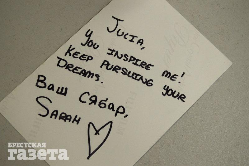 В ее коллекции есть также подписи белорусских звезд. Среди них Дарья Домрачева, Тео и Янина Малинчик. Актриса Брестского академического театра драмы снялась в российском фильме «Батальон», тем не менее очень удивилась, когда к ней подошли взять автограф, и даже рассказала об этом событии на своей странице в социальной сети Instagram.
