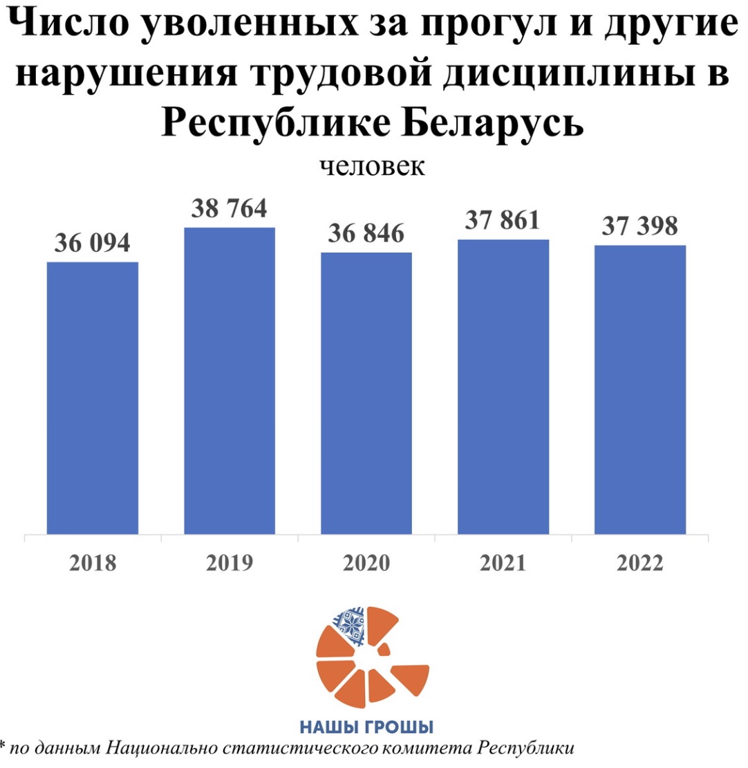 Из актуальных данных Белстата следует, что по причине прогула и других нарушений трудовой дисциплины только за прошлый год было уволено более 37 тысяч человек. Много это или мало? Если соотнести с общим числом увольнений за год, то выходит, что прогульщиков наберется около 5%. Причем эта цифра относительная стабильна.
