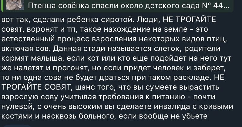 «Пожалуйста, не трогайте слетков. Рядом всегда родители, которые при вас просто боятся и не подлетают, но продолжают присматривать и подкармливать своих слетков, когда человек на безопасном расстоянии. Нельзя забирать совят домой, лучше родителей вы о них не позаботитесь, а риск, что от неправильного ухода птенец погибнет, очень высок», — призывает эксперт.