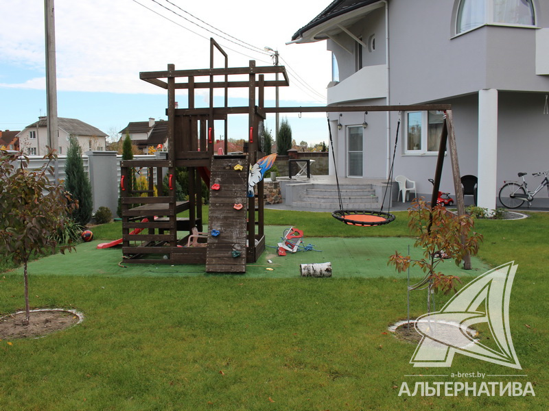 Материал стен – стружечная плита и железобетонные панели. Дом утеплен пенополистиролом, а фасад отделан штукатуркой «американка». Кровля выполнена из металлочерепицы, окна ПВХ. Общая площадь – 357,2 кв.м, а жилая 73,86 кв.м.