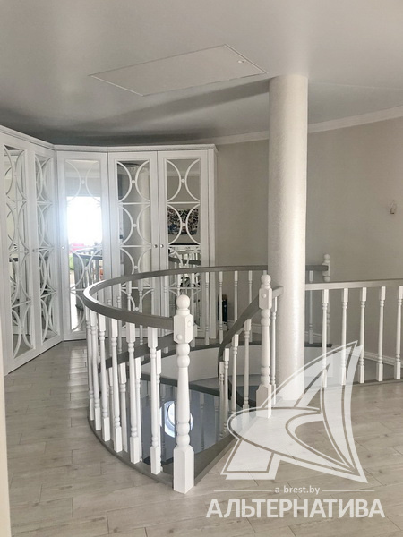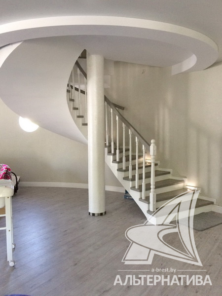 Подсвеченная лестница ведет на второй этаж, где расположены три жилые комнаты, ванная и второй санузел.