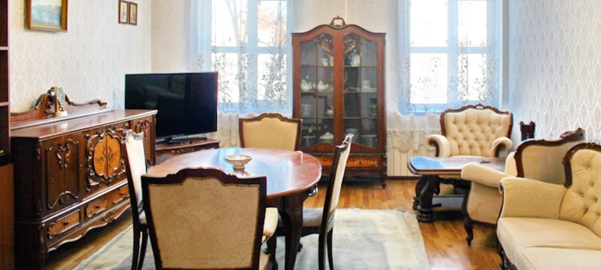 Квартира оформлена в старинном замковом стиле, гласит объявление. Гостиная обставлена корпусной мебелью «уникального дизайна». С виду комоды, стол, сервант, диван и кресла выполнены из дерева каких-нибудь благородных пород. Но, увы, наверняка это неизвестно.