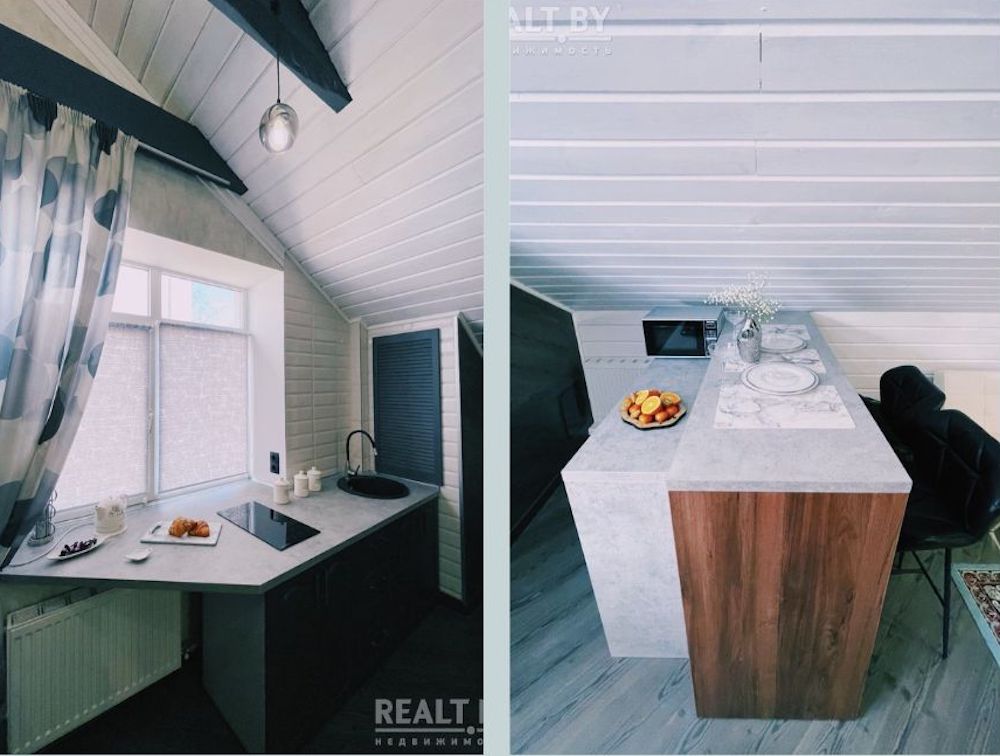 Стоит признать, хозяева умело распорядились маленьким пространством. Например, в кухне есть все необходимое: холодильник, микроволновая печь, небольшая сенсорная плита, мойка и пространство для приготовления еды. С другой стороны — обеденный стол.