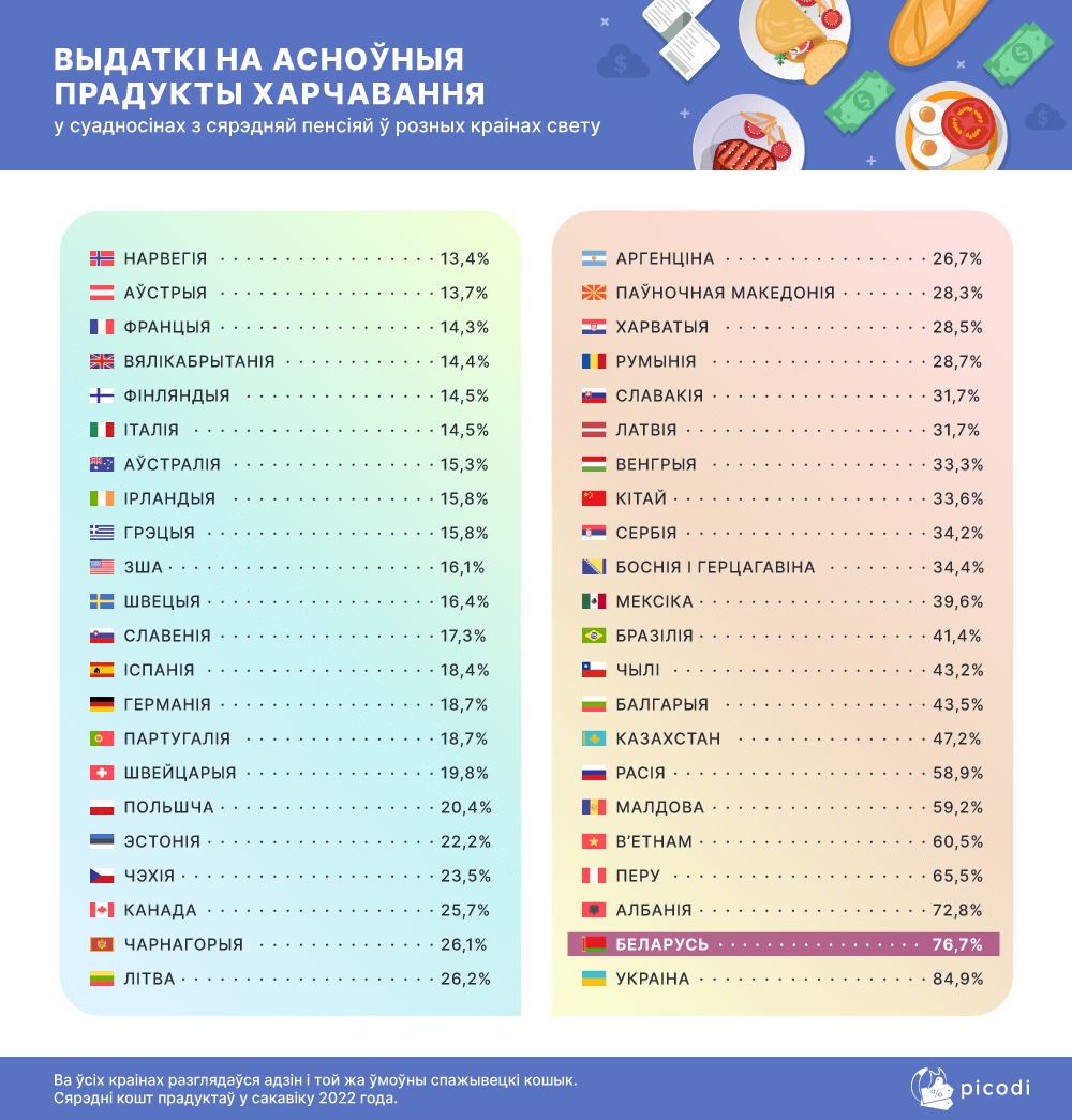 В данном рейтинге Украина, Беларусь и Албания занимают последние места. Пенсионеры этих стран тратят на базовый продуктовый набор 84,9%, 76,7% и 72,8% от пенсионных выплат соответственно.