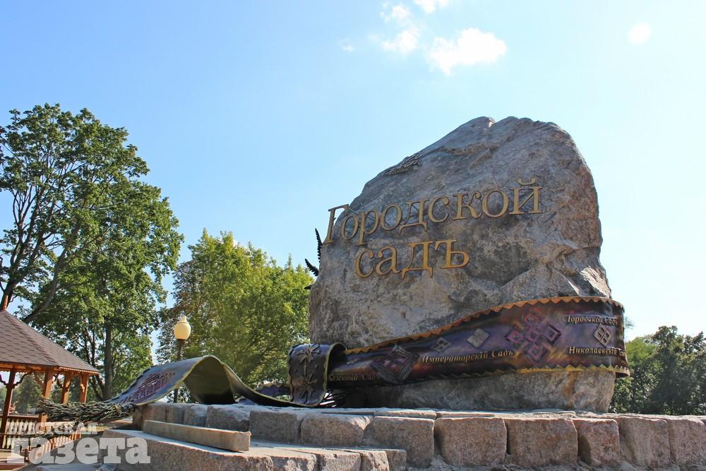 На огромном камне появилась надпись «Городской сад», которая видна издалека. У основания валун опоясан кованым рушником с белорусским орнаментом и летописью Сада.