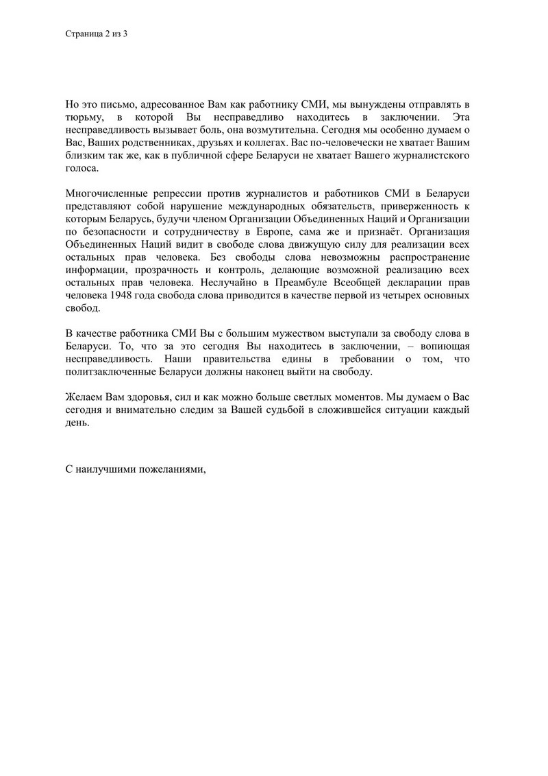 В качестве работника СМИ вы с большим мужеством выступали за свободу слова в Беларуси. То, что за это сегодня вы находитесь в заключении, — вопиющая несправедливость. Наши правительства едины в требовании о том, что политзаключенные Беларуси должны наконец выйти на свободу.