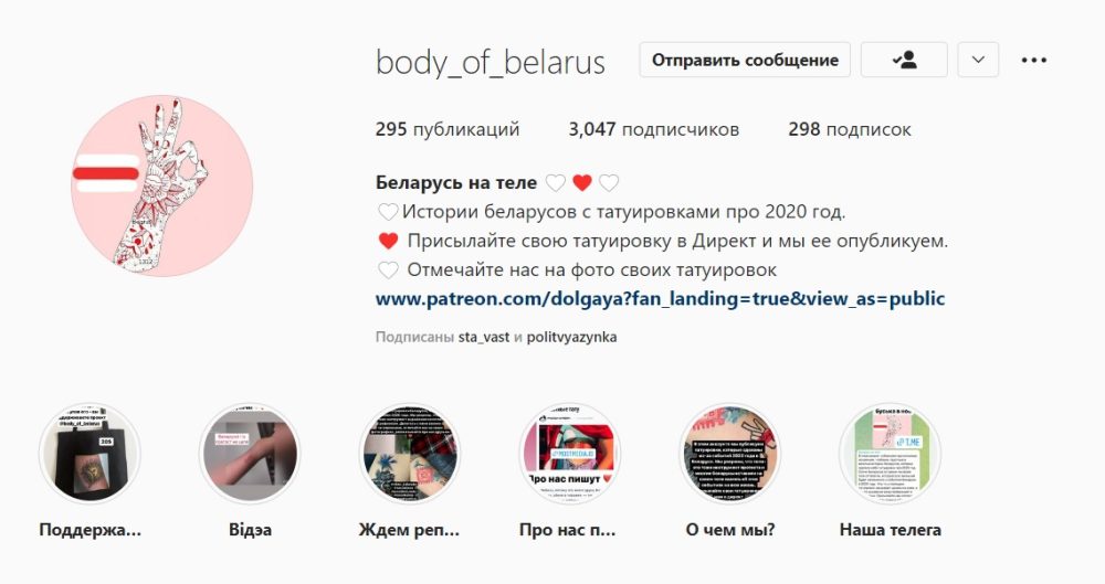 Это подтолкнуло журналистку Евгению Долгую, которую тоже задерживали и чью татуировку тоже фотографировали, сделать материал про протестные татуировки беларусов. Она написала в соцсетях, что ищет героев, которые готовы рассказать про свои татуировки. С поиском помогла Дарья Лосик, жена политзаключенного барановичского блогера и журналиста Игоря Лосика, которая репостнула в Instagram сториз Евгении.