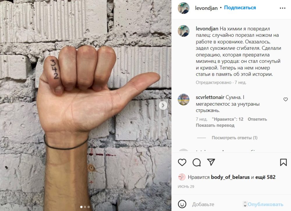 «Химию» Левон отбывал в ИУОТ №45 в деревне Сушки Каменецкого района. Там он работал в колхозе. Во время работы в коровнике он случайно порезал ножом палец и задел сухожилие. Ему сделали операцию, но мизинец теперь не сгибается и не разгибается. В память об этой истории Левон набил на мизинце 342 — номер статьи УК, из-за которой попал на «химию».