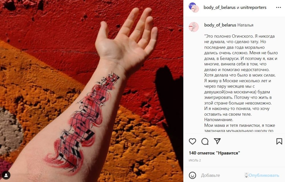 «Больше всего меня поразила татуировка, связанная с эмиграцией. Девушка набила на левой руке ноты из полонеза «Прощание с Родиной» Михаила Клеофаса Огинского. Она закончила музыкальную школу по классу фортепиано, поэтому историю этого полонеза знала давно. Для нее это память о доме, маме, музыке, крови беларусах, БЧБ-флаге, гордости и силе. Также это ее прощание с Родиной, ведь она тоже уехала из Беларуси и не знает, когда вернется», — рассказывает авторка проекта.