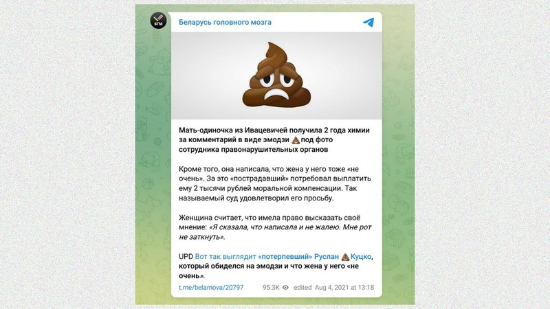 Суд Ивацевичского района признал Ольгу Кронду виновной в «оскорблении» представителя власти и назначил два года домашней «химии». Ее обязали выплатить потерпевшему Куцко 2 000 рублей в качестве моральной компенсации, которую он обосновал тем, что из-за эмодзи в виде какашки его жене поступали угрозы.