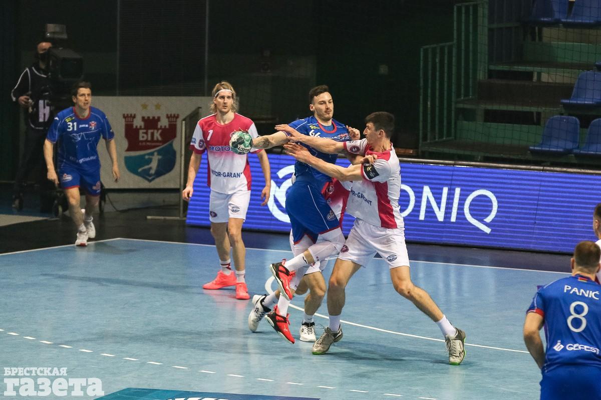 Гандболисты «Мешков Брест» начали игру предельно собранно. Это позволило захватить лидерство со старта и повести «плюс три». Настрой парней Рауля Алонсо был запредельный. В результате разрыв вырос сначала до семи, а на 26-й минуте счет стал 15:5 в пользу хозяев.
